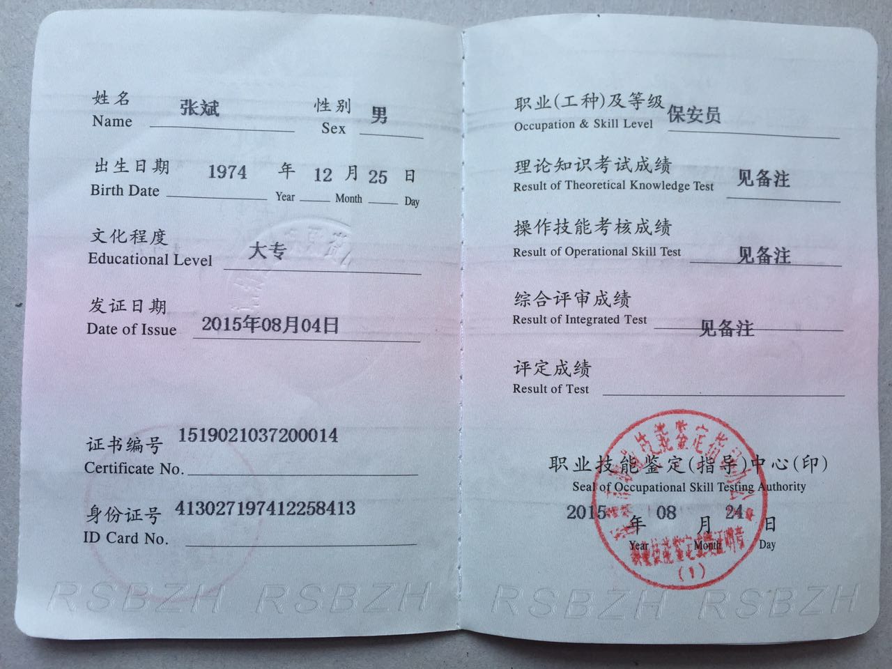 热烈祝贺我公司护卫二部经理张斌获得国家人力资源和社会保障部颁发的“保安员二级技师资格证”